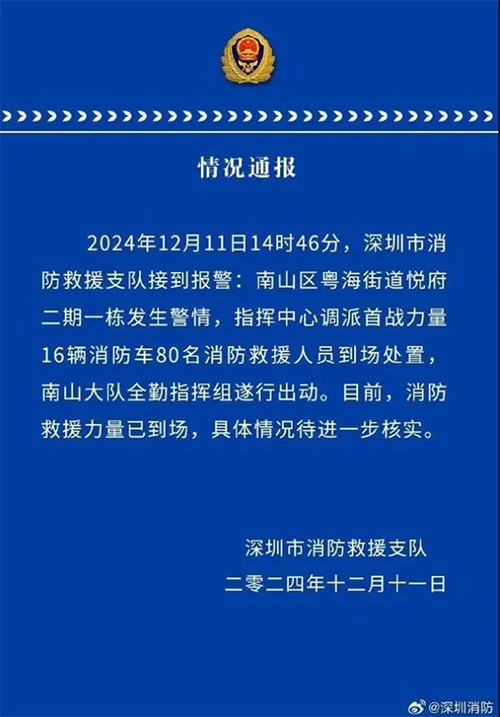 12月11日15時據(jù)相關(guān)媒體報道,深圳市消防救援支隊指揮中心調(diào)派首戰(zhàn)力量16輛消防車80名消防救援人員到場處置,南山大隊全勤指揮組遂行出動 。2024年12月11日16時許,現(xiàn)場消防救援人員初步排查,起火原因為燃?xì)獗ǎ瑝嫎侨藛T已被120拉走 。截至12月11日18時,大火已熄滅,事故造成1人死亡,無其他人員受傷 ;搜救工作已經(jīng)結(jié)束,當(dāng)?shù)鼐揭呀槿胝{(diào)查此事 。