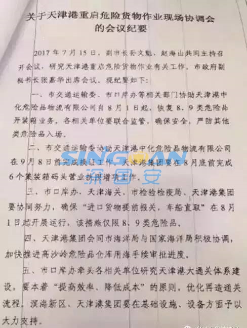 有消息稱,8月1日起,天津港重啟危化品運輸業(yè)務,危險品中的第8類,第9類危險品開裝箱業(yè)務,將率先得到恢復。日前,天津市副市長孫文魁,趙海山共同主持召開會議,研究天津港重啟危險品貨物作業(yè)有關(guān)工作。