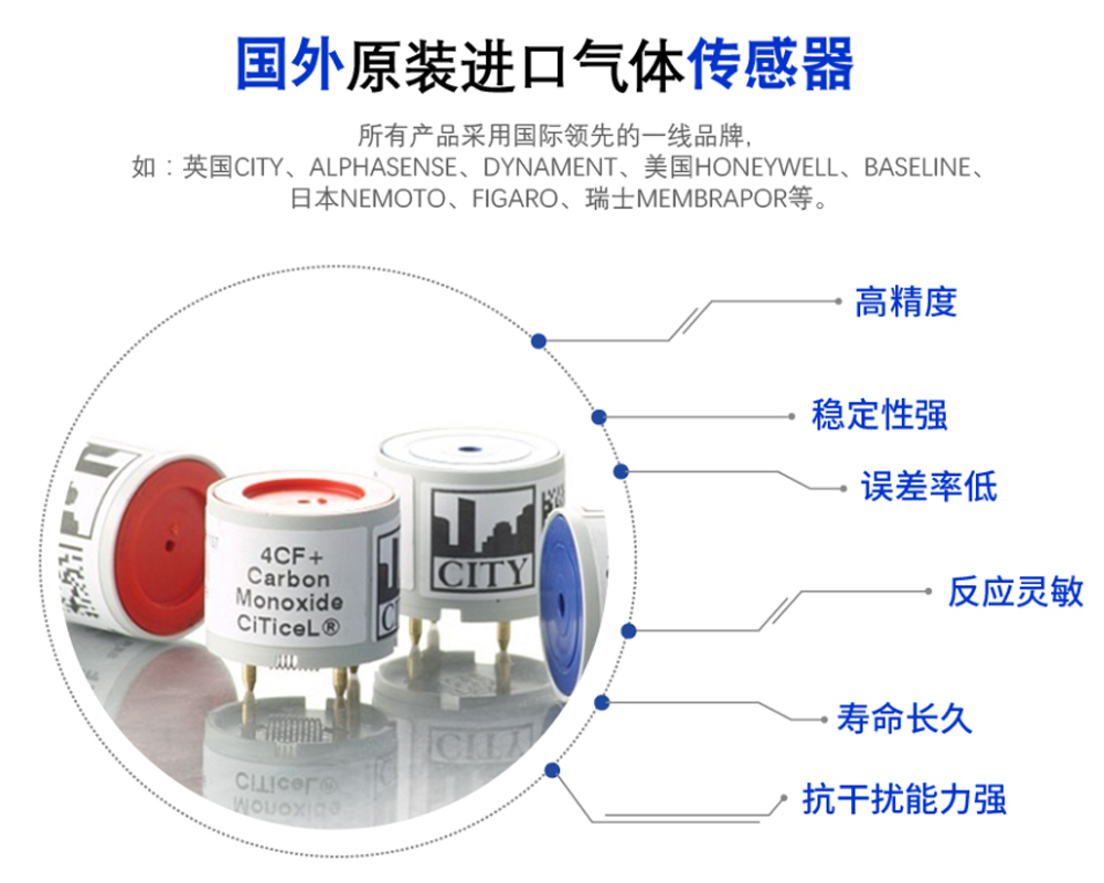 ●國(guó)外原裝進(jìn)口四電級(jí)氣體傳感器,性能穩(wěn)定,分辨率高;