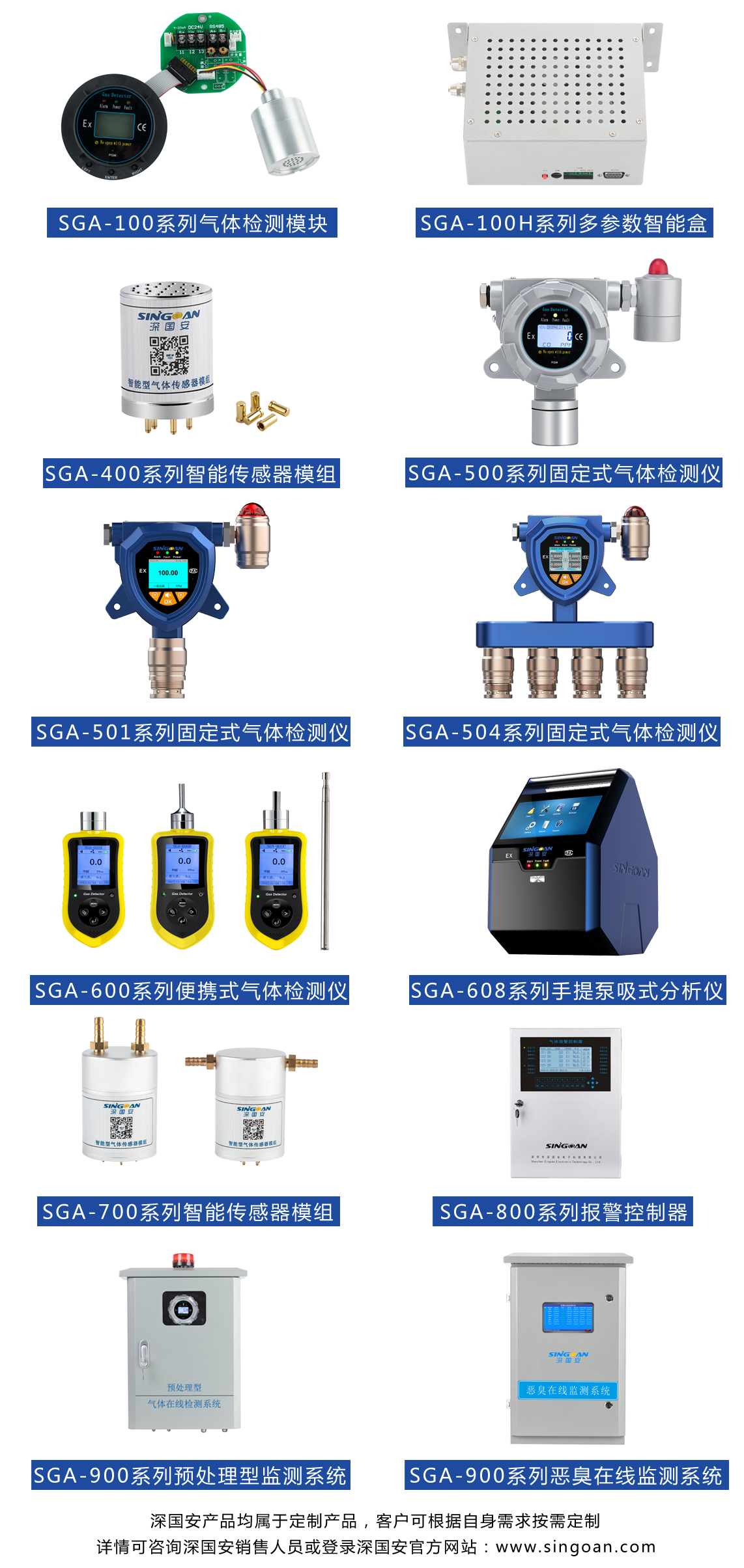 深國(guó)安產(chǎn)品涵蓋智能型氣體傳感器模組、多參數(shù)大氣檢測(cè)模塊、固定式氣體泄漏報(bào)警器、便攜式氣體檢測(cè)儀、手提式氣體分析儀、VOC在線監(jiān)測(cè)系統(tǒng)、微型空氣質(zhì)量監(jiān)測(cè)站、CEMS煙氣專用高溫檢測(cè)探頭、惡臭電子鼻在內(nèi)的九大系列,支持10000余款易燃易爆、有毒有害和VOC揮發(fā)性氣體檢測(cè)產(chǎn)品;